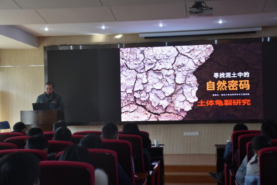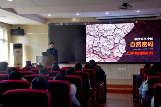 在提问交流环节,多名师生针对唐教授的报告积极踊跃提问,针对土体分层和厚度对土体龟裂的影响、土体龟裂的卷曲现象、实验土体的矿物成分组成和离散纤维的污染等问题与唐教授进行了互动交流。唐教授一一耐心进行了解答,报告会现场气氛十分热烈。