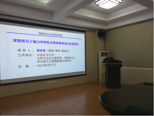 杨圣奇教授的报告围绕“深部岩石三轴力学特性及损伤破裂演化机理研究”开展。他从深部岩石力学研究背景谈起,结合我国深长隧道工程、核废料处置地下工程等应用现状,简述深部岩石力学的研究进展。随后,以大理岩、泥岩、花岗岩、砂岩为例,通过翔实的宏细观实验数据、颗粒流离散元模拟结果和分析图表,重点探讨了高温度和渗透压力对岩石三轴力学特性的影响规律,阐释了深部岩石在复杂应力与环境下的损伤破裂演化机理。会后,杨圣奇教授与参会师生展开了相关科研经验的分享与交流,并由窦斌教授对报告会进行了总结发言。
