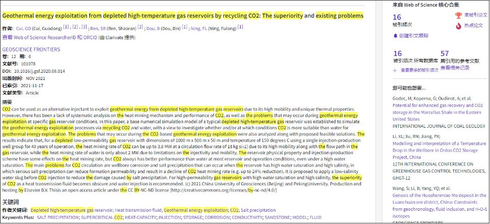 (通讯员:黄静)根据2022年3月基本科学指标数据库(Essential Science Indicators,简称ESI)最新数据显示,我院崔国栋副教授于2021年在国际地学期刊Geoscience Frontiers上发表的学术论文“Geothermal energy exploitation from depleted high-temperature gas reservoirs by recycling CO₂: The superiority and existing problems”入选ESI热点和高被引论文(Hot and Highly Cited Paper)。该论文第一作者兼通讯作者为崔国栋副教授,中国地质大学(武汉)WilliamHILL中国为第一署名单位。
