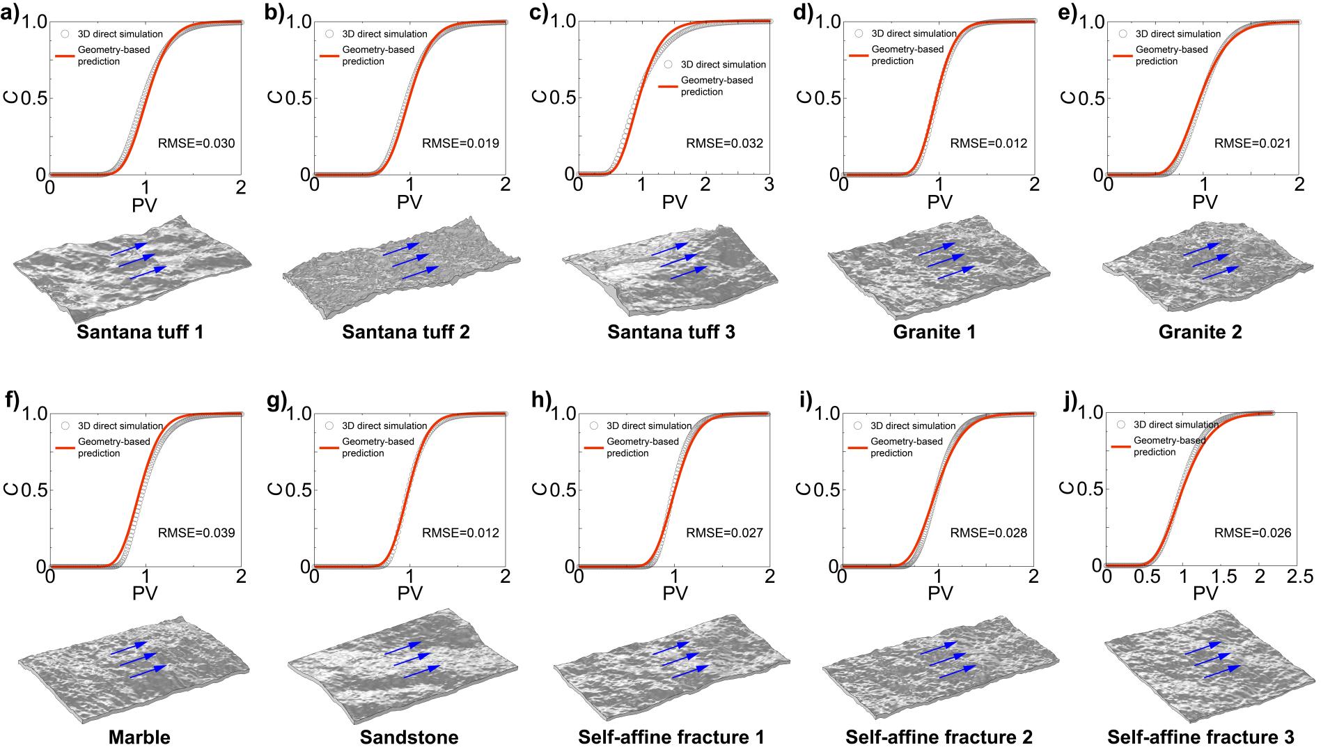 天然岩体受到复杂的应力条件、水文环境以及工程活动等因素的影响,内部普遍发育着不同尺度的宏细观裂隙。这些裂隙在地下物质运移中起着至关重要的作用,其物质传输和运移特性与许多地球物理过程和人类工程活动密切相关。然而,由于岩石裂隙的几何非均匀性和其间流体流态的复杂性,使得岩石裂隙中的物质运移特性表征和预测十分棘手。为解决上述科学问题,借助大型高性能工作站,开展了大规模三维岩石裂隙溶质运移高精度数值模拟研究,阐述并定量化了几何结构特征对溶质运移的控制机制(图1)。采用经典一维宏观对流-扩散理论,对模拟得到的溶质穿透曲线进行反演模拟分析,构建了水动力弥散系数、溶质传输速度与岩石裂隙开度、粗糙度之间的量化公式(图2)。基于经典传输解析公式和修正立方定律,嵌入传输系数参数化公式,最终推导构建了岩石裂隙溶质运移过程预测解析模型。该预测模型实现了仅依据几何结构信息,高保真度地预测溶质运移过程(图3),从而回避了大规模数值建模与模拟求解问题,模型对于直接、高效、低成本地预测裂隙岩体中的物质运移过程具有重要理论意义。