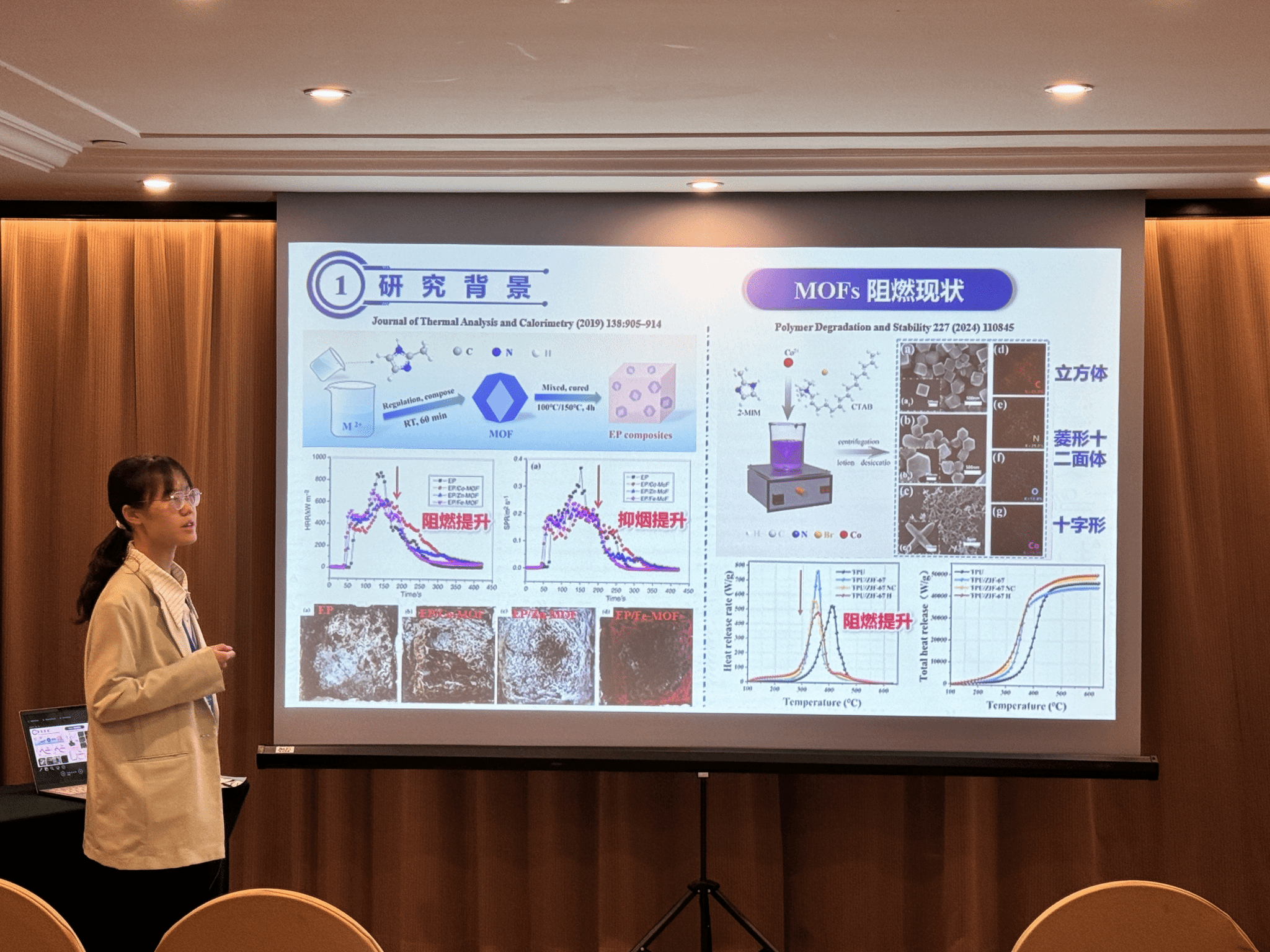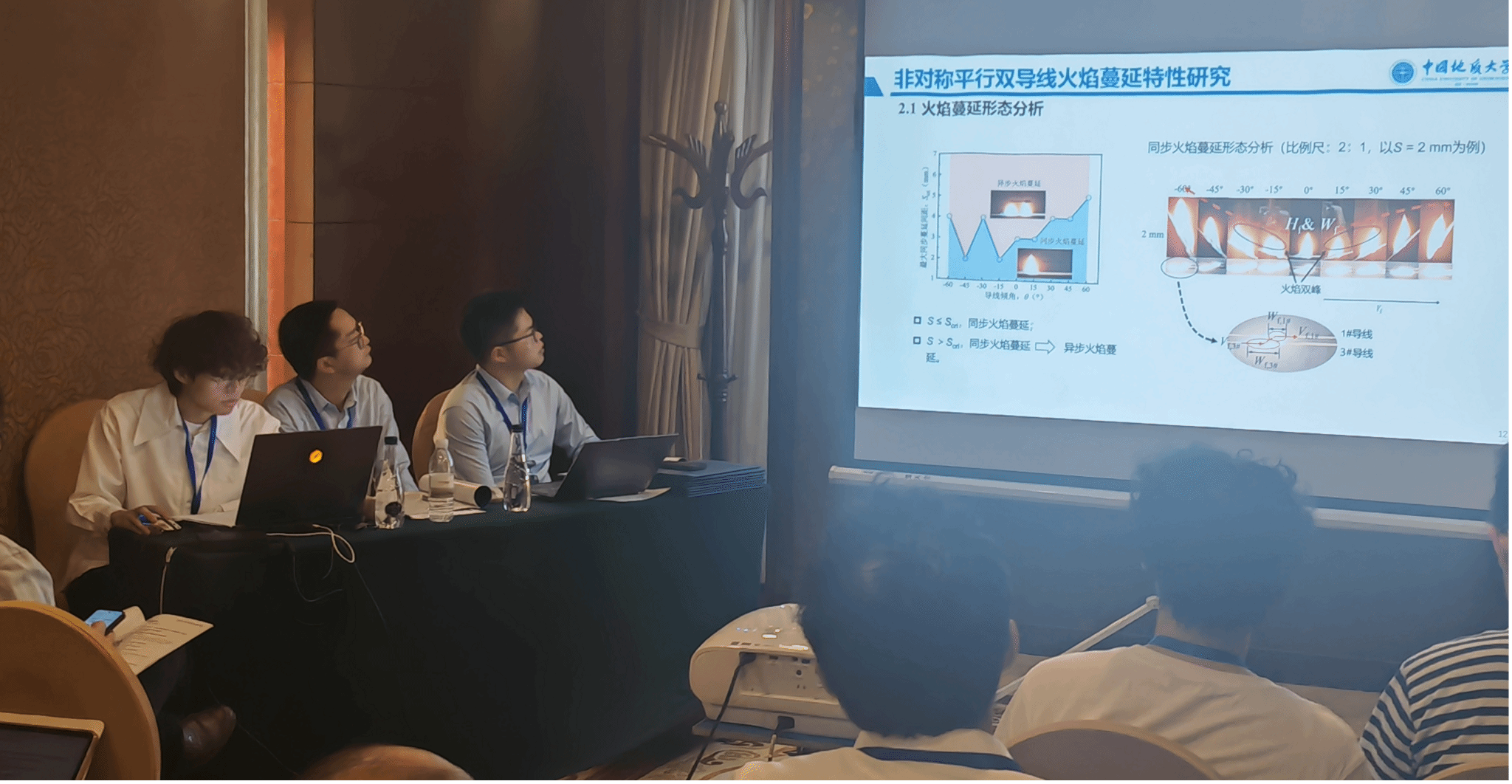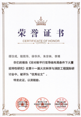 此外,我院研究生印恋在阻燃耐火论坛作题为“卟啉基有机框架衍生物分子设计及其阻燃增韧研究”报告、罗瑊瑊在阻燃耐火论坛作题为“生物启发微中空MOFs的界面锁定效应:环氧树脂复合材料的耐火与增韧性能优化研究”报告、缪汝成在火灾机理论坛作题为“非对称平行双导线布局条件下火蔓延特性研究”报告,孟祥龙在火灾烟气论坛作题为“空气幕射流作用下的开口溢流发展行为研究”报告,宗志伟在受限空间火灾论坛作题为“墙角型壁面限制条件下的火羽流行为特性研究”报告。其中,陆凯华副教授指导的硕士研究生缪汝成获得会议优秀论文奖。