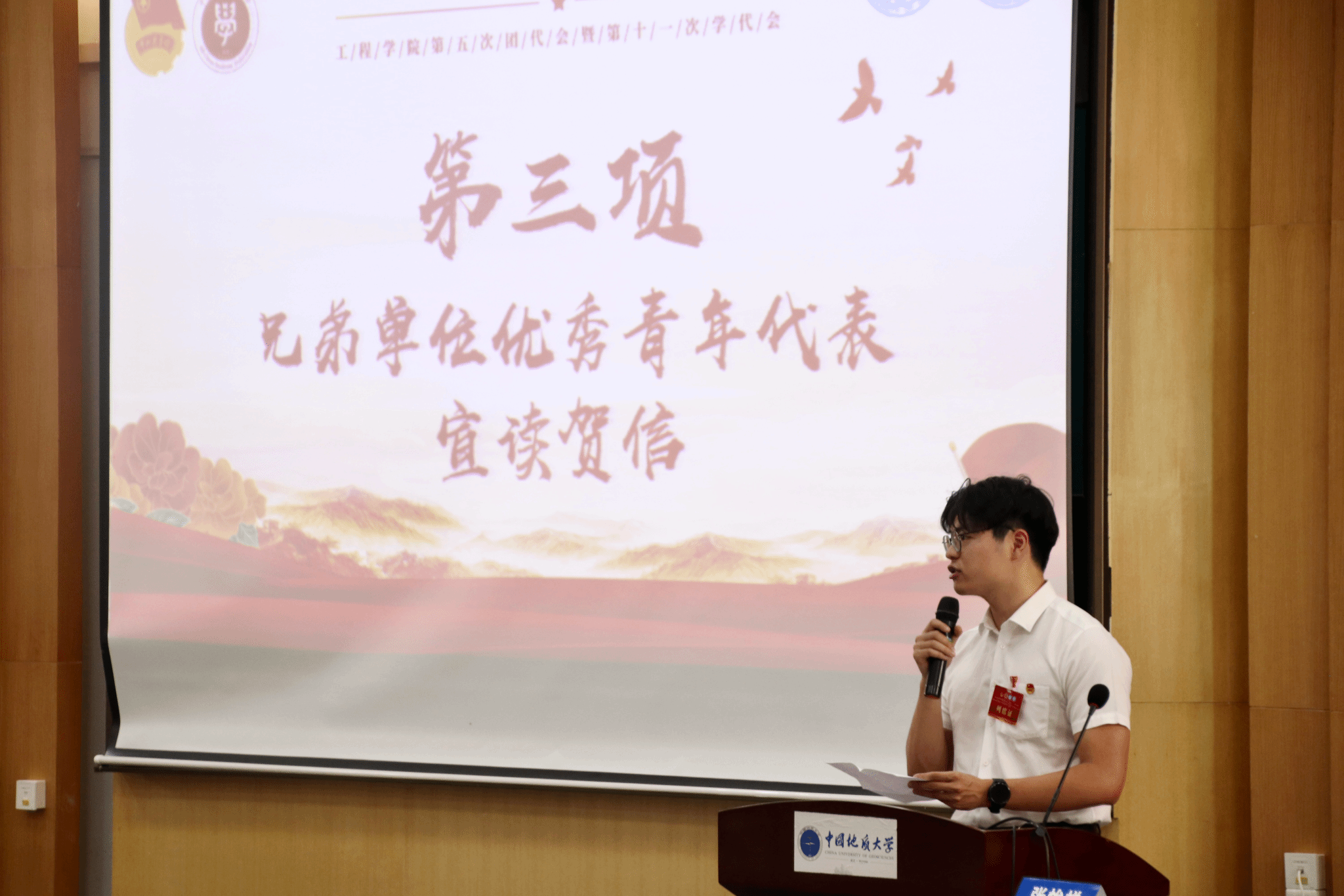 兄弟单位优秀青年代表华中农业大学工学院专职团干贾彦平和2024年全国“青马工程”班委、华中科技大学马克思主义学院硕士研究生张扬分别宣读贺信,贺信中饱含着兄弟院校对WilliamHILL中国的美好祝愿与深厚情谊,彰显了青年一代团结奋进、携手共进的精神风貌。本次大会还收到了华中科技大学土木与水利WilliamHILL中国、武汉理工大学土木工程与建筑学院等兄弟高校团委,以及中建三局基建投、武汉地铁集团和中交四航院研究院等企业团组织的贺信。