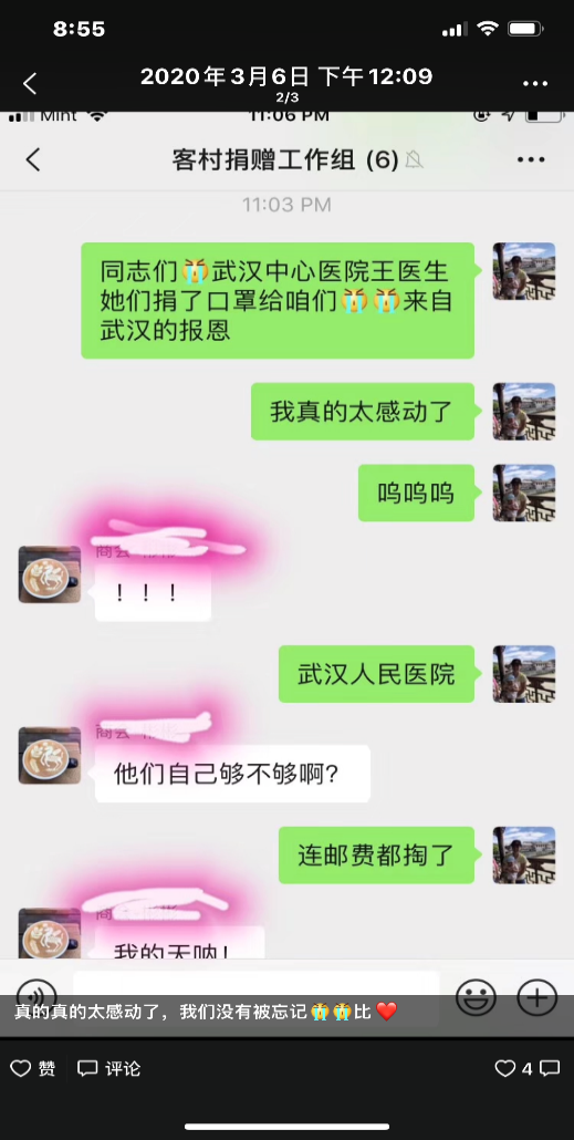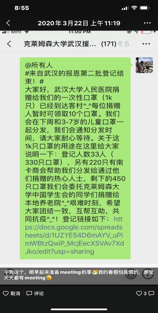 苗发盛、桂蕾分享身边同学募集物资的故事,无论是国外的留学生还是国内的青年人在国难面前乐于奉献,为抗疫尽一份力,表现出了当代青年的社会使命感和责任感。其中,美国南卡罗来纳州Clemson University华人留学生,詹威威、叶红丽夫妇,在国内疫情爆发期间,自发组织华人留学生,募捐一次性口罩、医用防护服等物资,克服种种困难,分批次寄往国内。后来美国疫情爆发,武汉大学人民医院又捐赠防护物资给留学生,让大家感受到了国家的温暖,体会到了相互帮助的可贵。