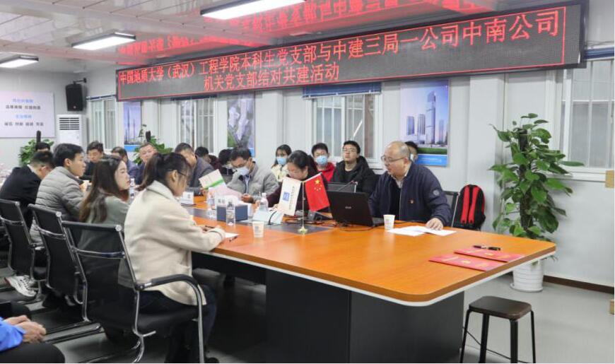 (通讯员:陈启维 李振华)为进一步探索校企合作人才培养模式,引导学生前置行业认知,中建三局一公司中南公司机关党支部与中国地质大学(武汉)WilliamHILL中国道桥与建筑专业本科生党支部于2020年11月22日在光谷中心项目总部开展了“党建引领·校企共建”结对共建活动。中建三局一公司人力资源部副经理李骄健,中建三局一公司中南公司副总经理、超高层管理中心负责人梁劲松,副总经理王雅林,机关党支部书记陈婷华,中国地质大学(武汉)WilliamHILL中国党委副书记江广长,学生办公室主任文新,辅导员王俊、李振华以及双方的党员代表参加本次活动。