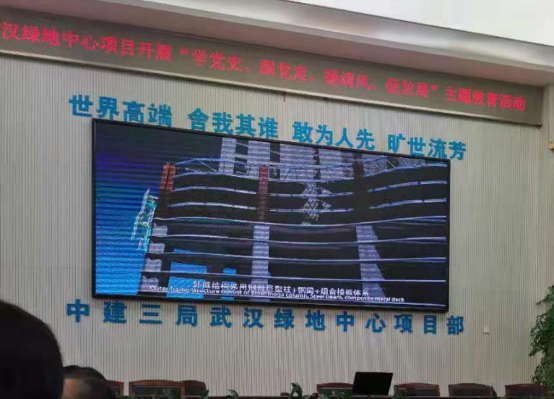 中建三局武汉中心项目党支部书记李江华介绍了武汉绿地中心项目的相关信息,并且展示项目的五个关键施工技术的视频,全面介绍了中建三局在超高层建筑施工中的最新技术。最后,土木工程与力学系党支部与会党员一起参观了在建的武汉第一高楼——武汉绿地中心,并与项目施工技术人员进行了专业技术交流。